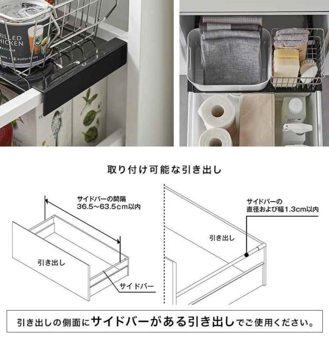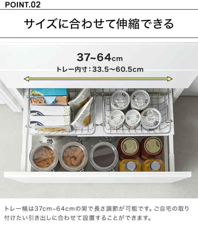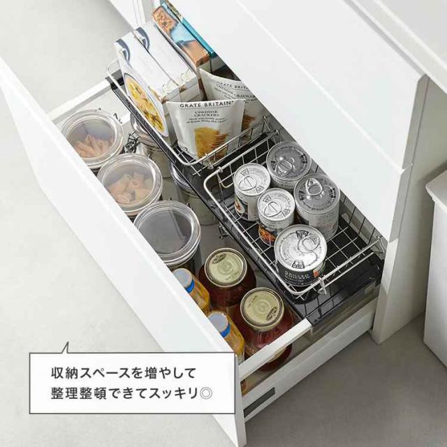 伸縮できるので引き出しの幅にピッタリフィット!収納を2段に分けて有効活用できる引き出し中ラック。キッチンや洗面台の引き出しのサイドバーに掛けるだけで収納力がアップ!ストックと日常使いの物を分けて収納。引き出し手前に設置すれば、日常よく使う物が取り出しやすくなります。場所をとる調理器具や保存容器などの収納に。引き出しのサイドバーに引っ掛けるだけの簡単設置。