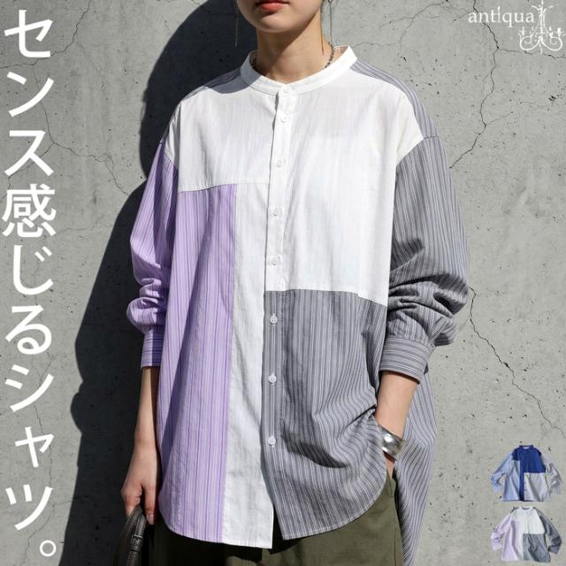 配色 ストライプ シャツ レディース バンドカラー 送料無料・(50)メール便可 春新作