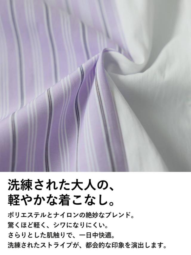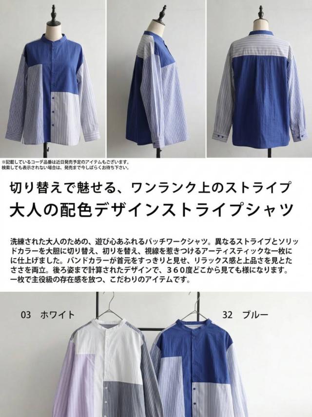 異なるストライプ柄と無地を組み合わせた配色デザインが特徴のストライプシャツです。