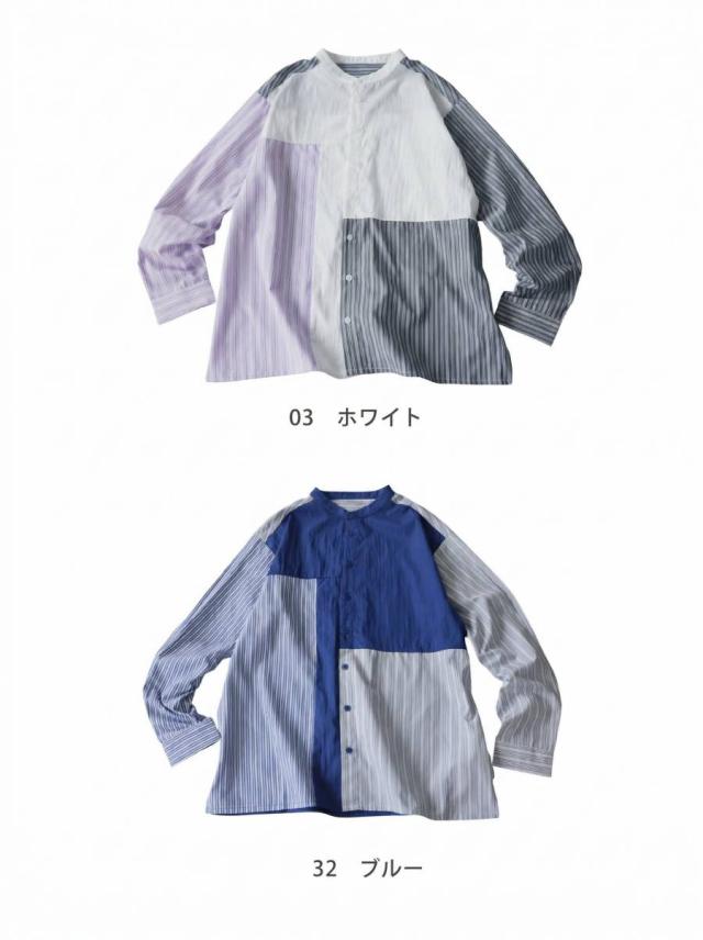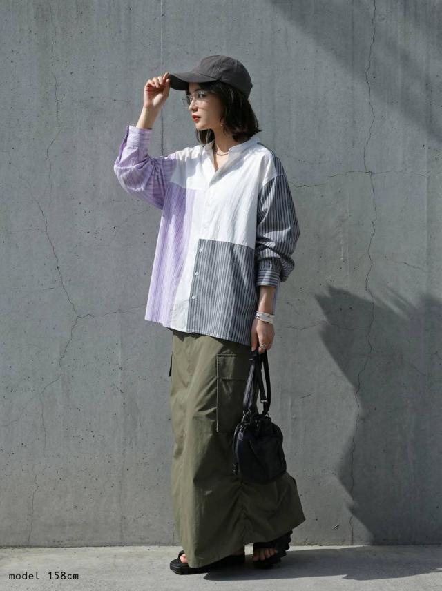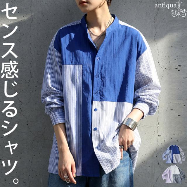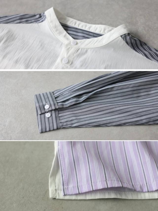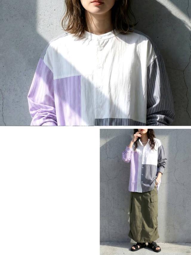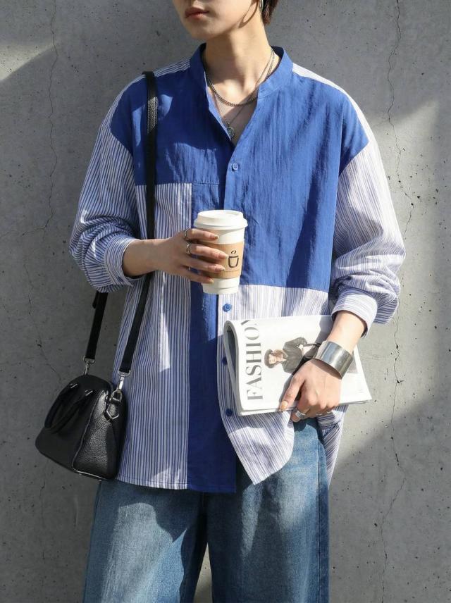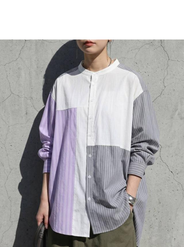 zk-00247 長袖 ストライプシャツ 異素材 切り替え バンドカラーシャツ デザインシャツ パッチワーク 前開き 柄シャツ トップス 羽織り レイヤード カジュアル 個性派 ユニセックス
