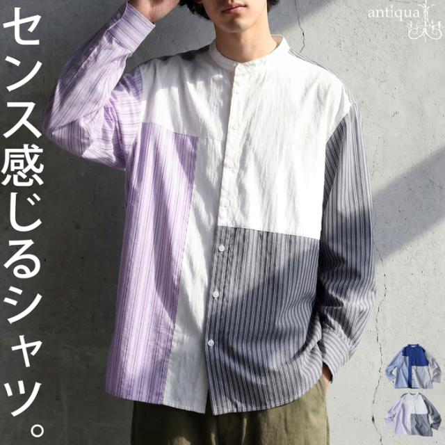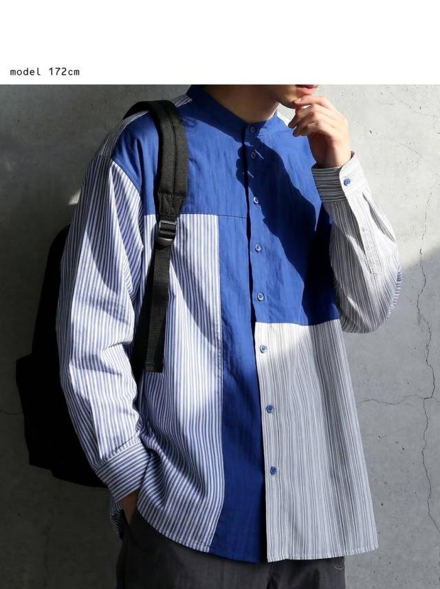 zk-00247z 長袖 ストライプシャツ 異素材 切り替え バンドカラーシャツ デザインシャツ パッチワーク 前開き 柄シャツ トップス 羽織り レイヤード カジュアル 個性派 ユニセックス