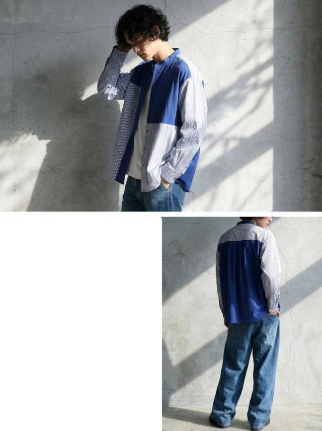 異素材の切り替えとパッチワークのようなデザインが目を引くデザインシャツで、コーディネートのアクセントになる一枚に仕上げました。