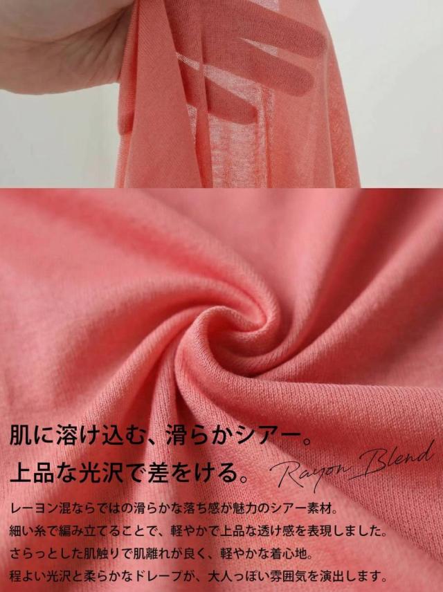 落ち感のあるレーヨンとナイロンのブレンド素材で、肌に触れるとさらりと滑らかな質感が広がります。
