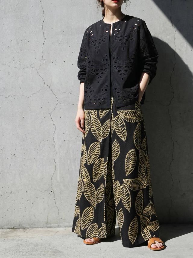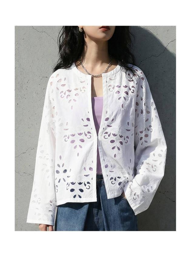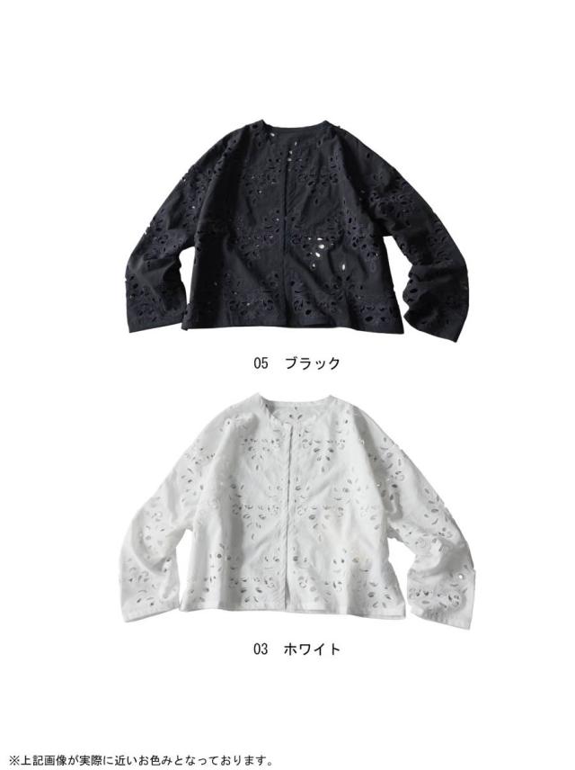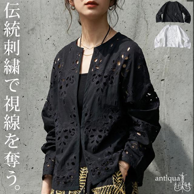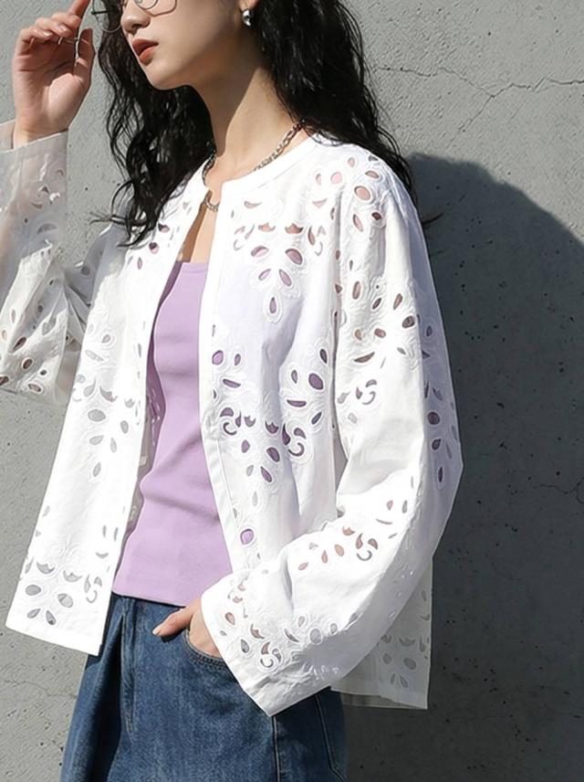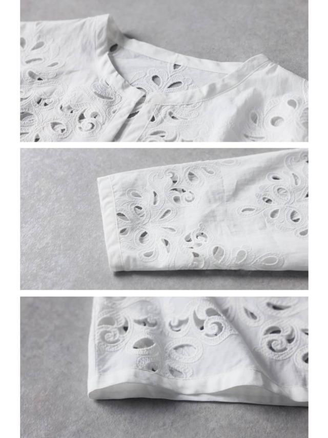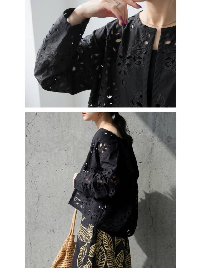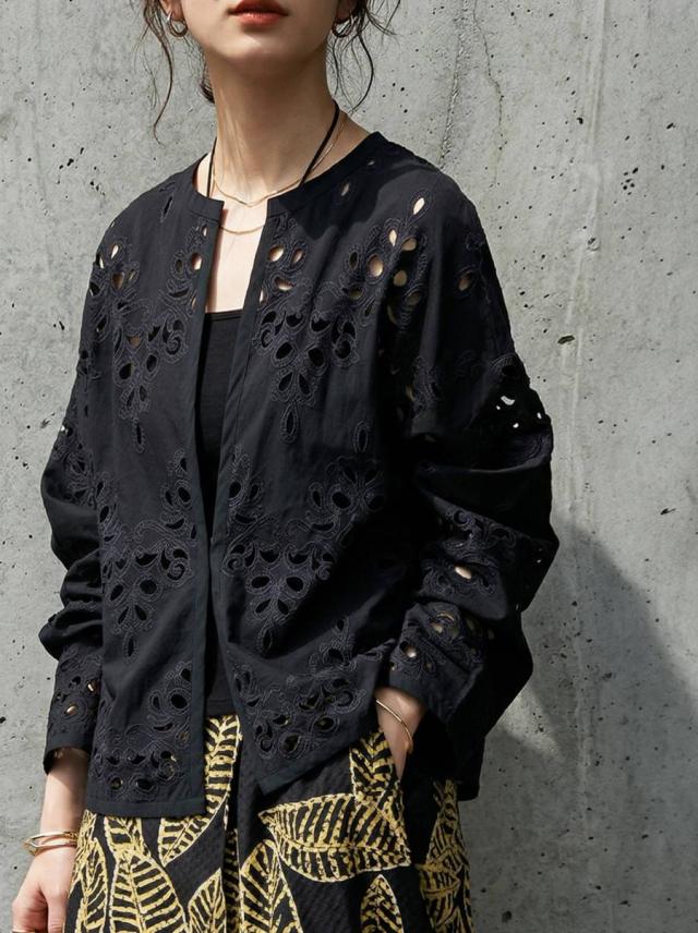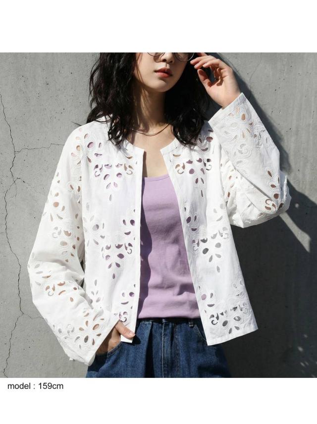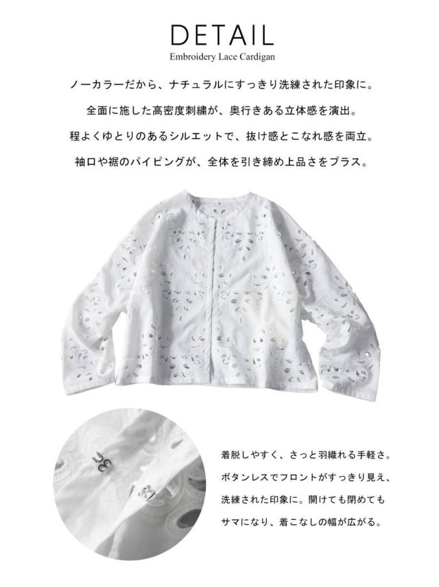 繊細な刺繍レースが目を惹く、クルーネックのノーカラーカーディガンです。