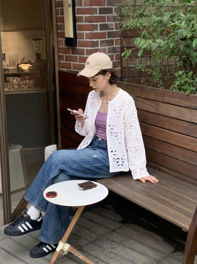 前開きのホック仕様でさっと羽織りやすく、軽やかな着心地が魅力の一枚です。