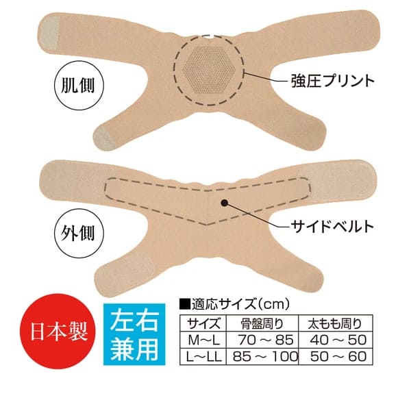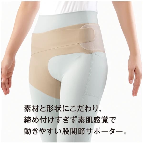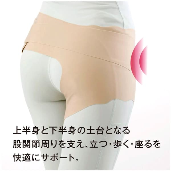 股関節、ふともも付け根の違和感に、立つ、歩く、座るを快適にサポート。素材と形状にこだわり、締め付けすぎず素肌感覚で動きやすい股関節サポーター。上半身と下半身の土台となる股関節周りを支えてくれます。薄手で素肌感覚で装着でき、違和感なく動けます。左右兼用、日本製。■強圧プリント!強めのパワープリントが負担のかかる股関節周りをしっかりサポート。■薄手で伸縮性があるので素肌感覚で動きやすい。肌着や水着に使われる生地が体の動きにフィットします。■サイドベルトで締め付け具合を調節。■整形学科専門医と共同開発!ぐしけん整形外科クリニック院長「具志堅 勉」さん監修。