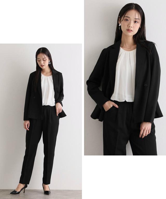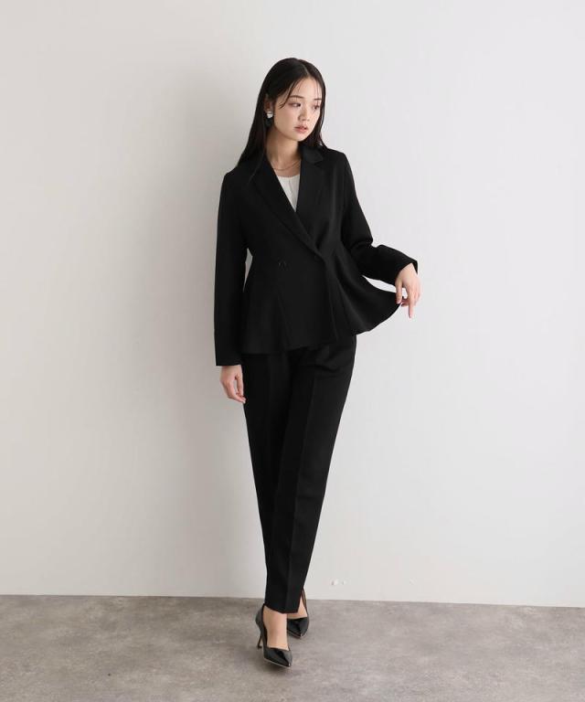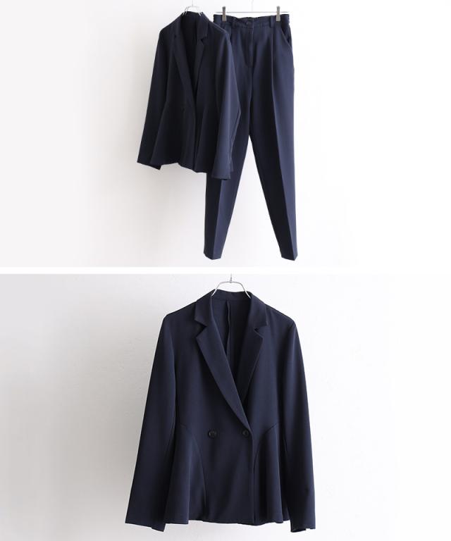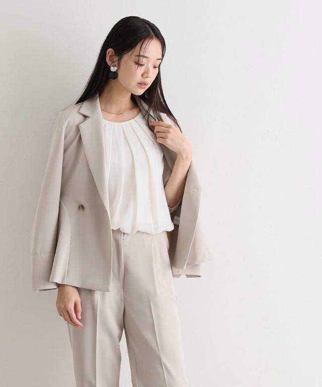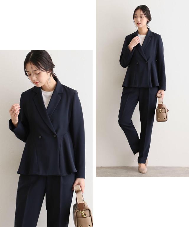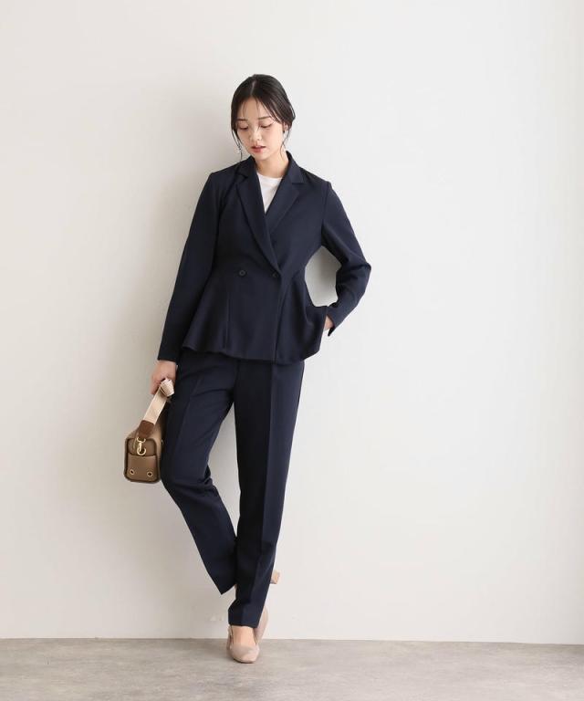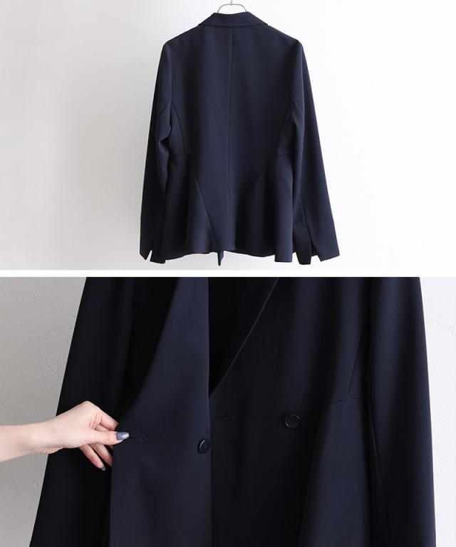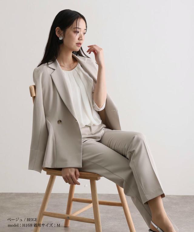 ダブルボタンのジャケットはほどよいウエストシェイプでスタイルアップ効果を発揮し、