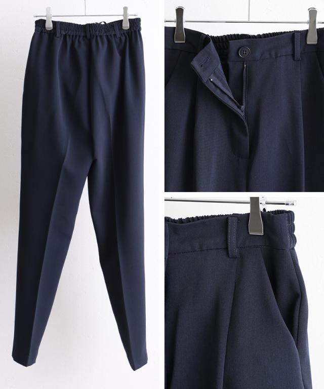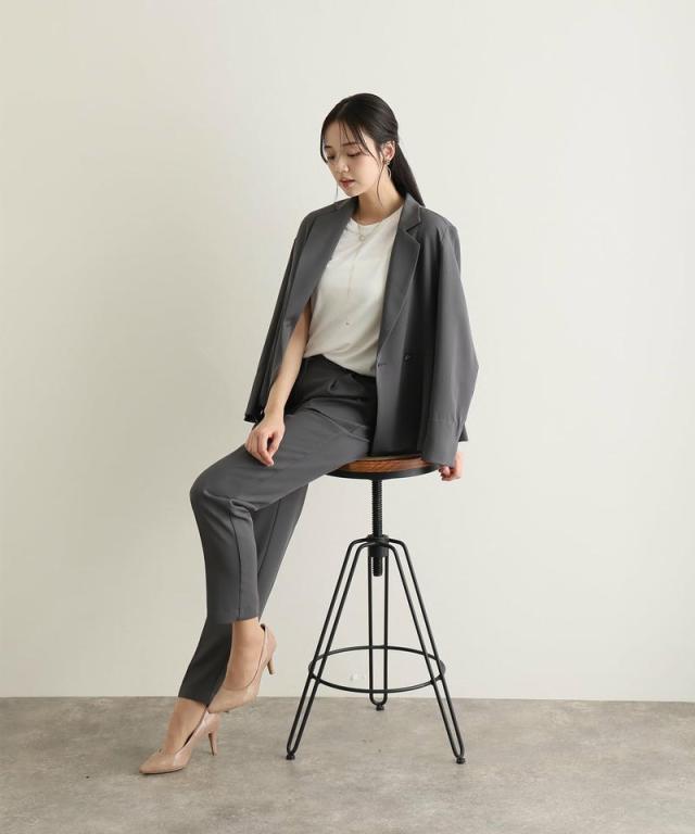 ボトムはすっきりとしたテーパードラインで、脚を長く見せつつ全体をバランスよく引き締めます。