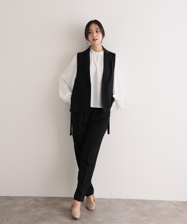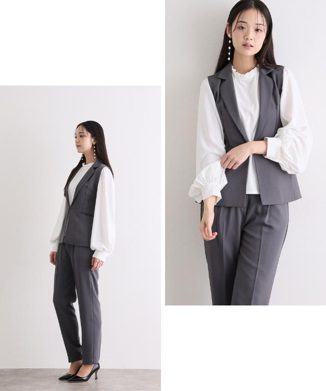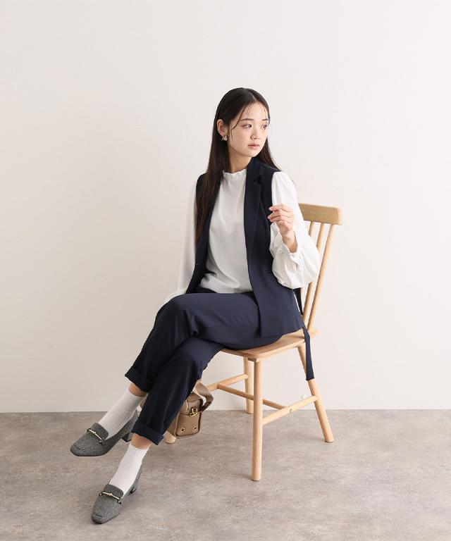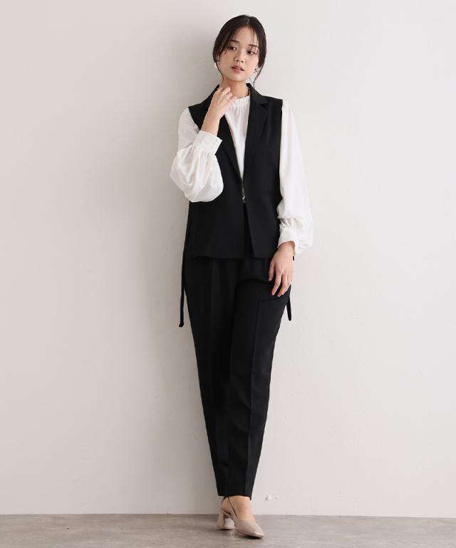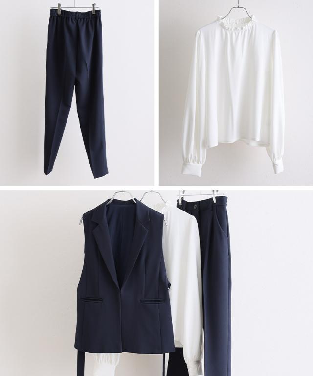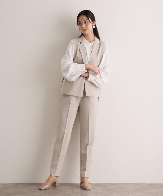 ジレ・パンツ・ブラウスのすっきり見えする上品な3点セット。