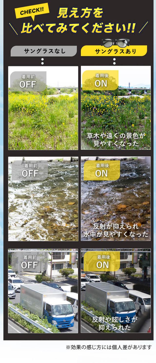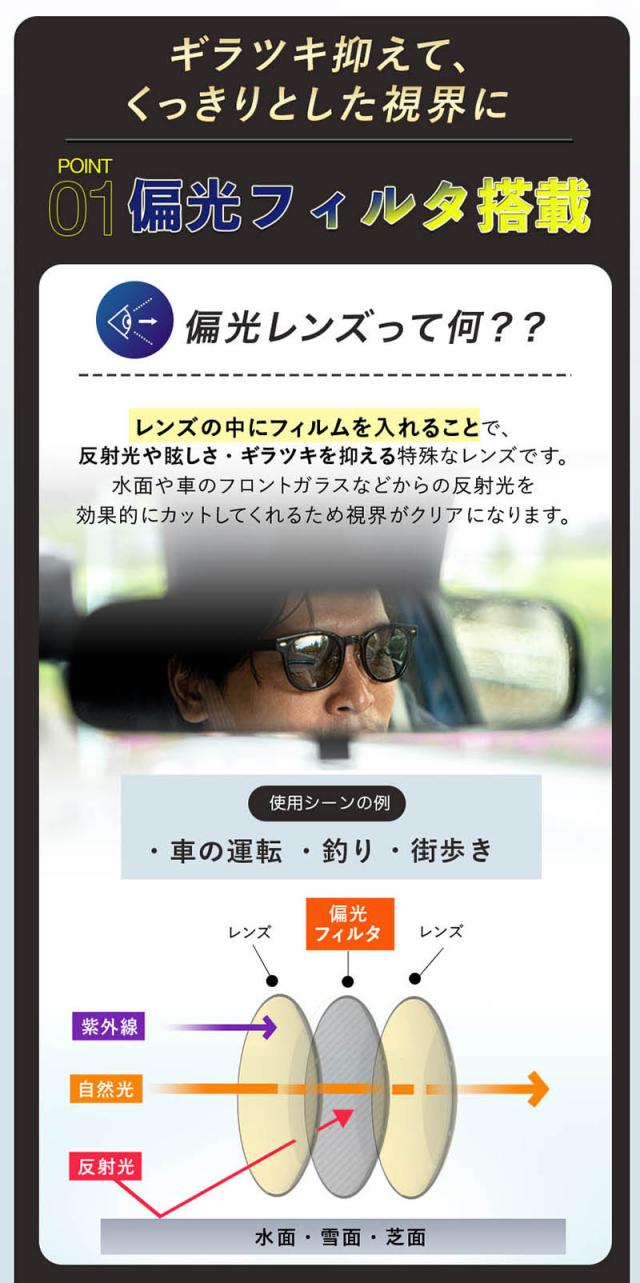 偏光レンズって何?レンズの中にフィルムを入れることで、反射光や眩しさ・ギラツキを抑える特殊なレンズです。 水面や車のフロントガラスなどからの反射光を効果的にカットしてくれるため視界がクリアになります。 車の運転、釣り、街歩きやアウトドアにオススメ