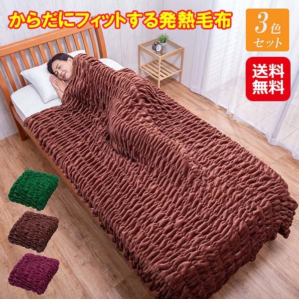 【からだにフィットする発熱毛布 3色組】【送料無料】 発熱毛布 吸湿発熱 毛布 ブランケット あったか 保温 静電気防止 洗える 丸洗い可能 冬 暖かい 寝具 防寒 寒さ対策 くしゅくしゅ毛布 ブラウン グリーン ワイン 3枚セット sd
