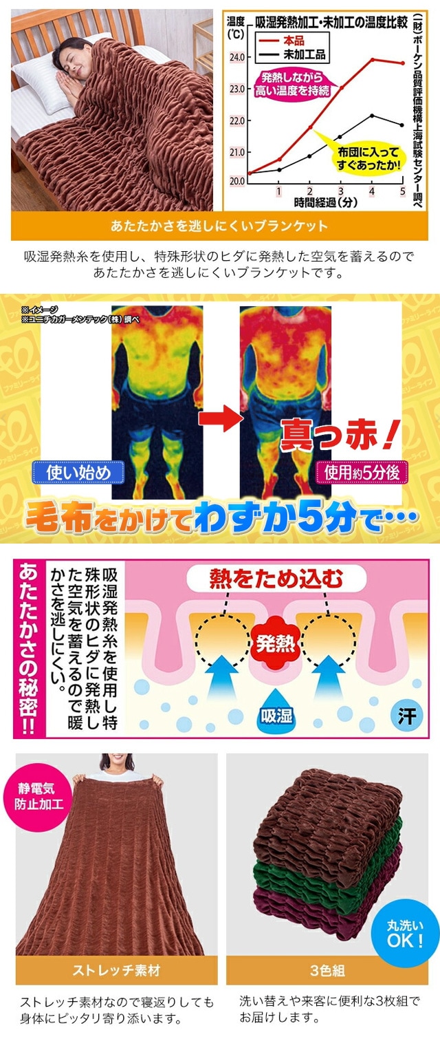 ■様々なご要望にお応えします【発熱毛布 吸湿発熱 毛布 ブランケット あったか 保温 静電気防止 洗える 丸洗い可能 冬 暖かい 寝具 防寒 寒さ対策 くしゅくしゅ毛布 ブラウン グリーン ワイン 3枚セット ファミラ ファミリーライフ 送料無料】