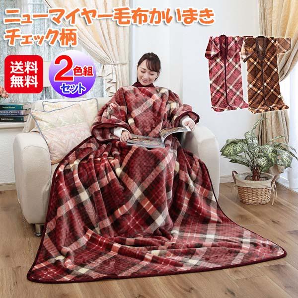 【ニューマイヤー毛布かいまき チェック柄 2色組】【送料無料】 かいまき布団 ニューマイヤー 着る毛布 大きい サイズ 毛布 ブランケット 袖付き 部屋着 防寒 あったか 首 肩 冷え対策 冷え性 冬 暖かい 寝具 洗える 洗濯 丸洗い可能 sd