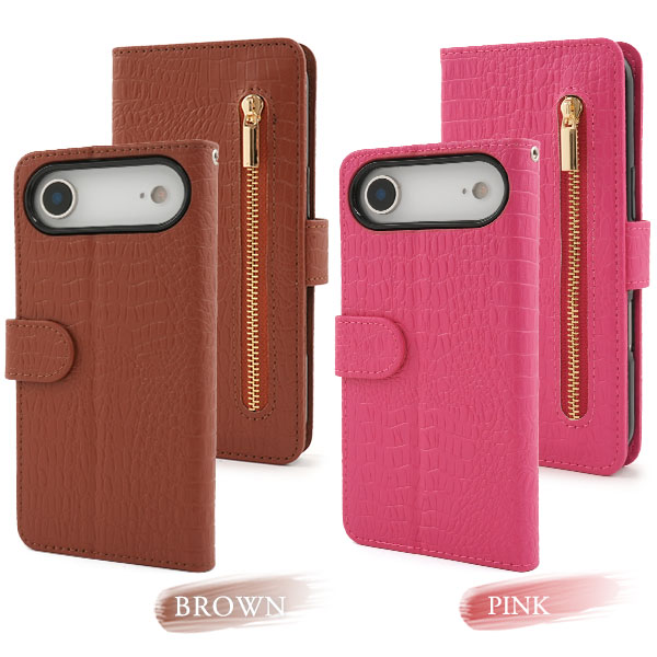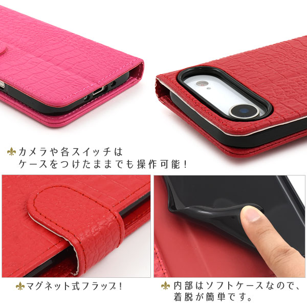 衝撃やキズなどからスマートフォンを守ります。 また、内部はソフトケースなので着脱が簡単です。 背面を折り返すとスタンドとして使用できるので、動画視聴に便利です。 横開きタイプなので、手帳のように使うことができます。 落下防止に最適なストラップホール付きです。 外側にファスナーポケットが付いているので、ちょっとした財布や小銭入れ代わりになって便利! また、内側に2つのカードポケットとサイドポケットが付いています。 高級感溢れるクロコダイルレザーデザイン。 ビジネスやカジュアルなど様々なシーンで活躍します。 |