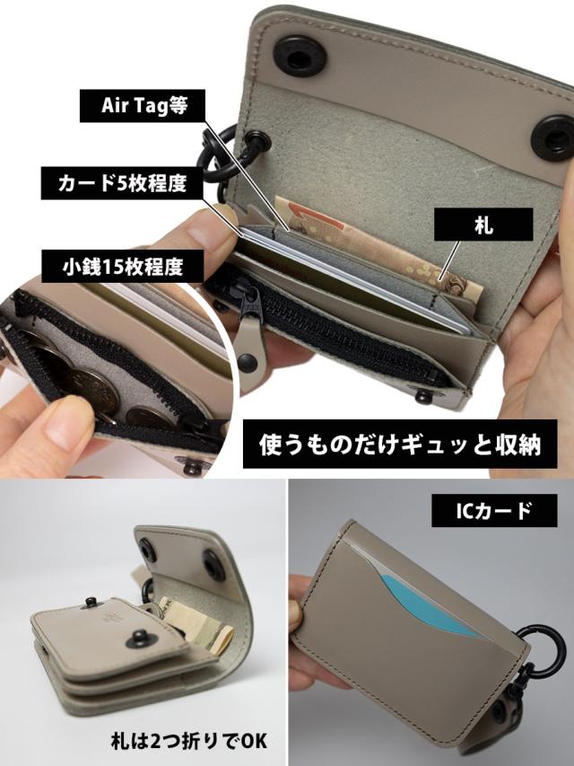2つ折りにした札・カード・紛失防止タグなどが入るポケット、手前に小銭入れ、背面にICカードが入るポケットがついた機能的なデザインです。