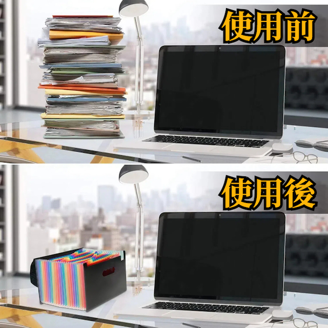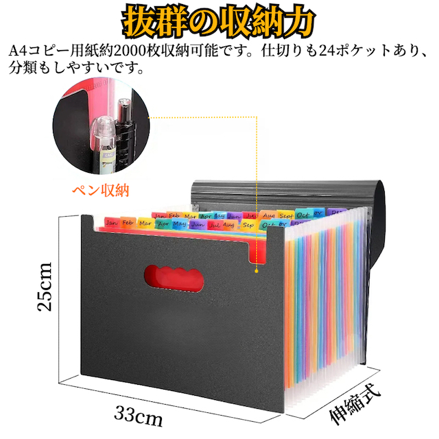 24ポケットがあります。必要に応じて伸縮可能なアコーディオン式 のドキュメントファイルです。書類の枚数に合わせて幅を調節でき、省スペースに書類整理が可能、1ポケットにはA4用紙83枚以上を収納可能です。デスクの上にしっかり置ける自立型ドキュメントファイルです。