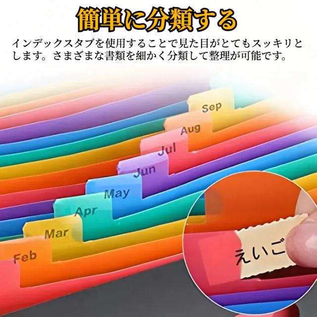 ドキュメントファイルの内側はカラフルで、書類を色別に分類できます。またはインデックスタブが付いており、さまざまな資料を見つけやすく整理できます。資料や小物分類に使用できます。高効率に勉強と仕事に役に立ちます。