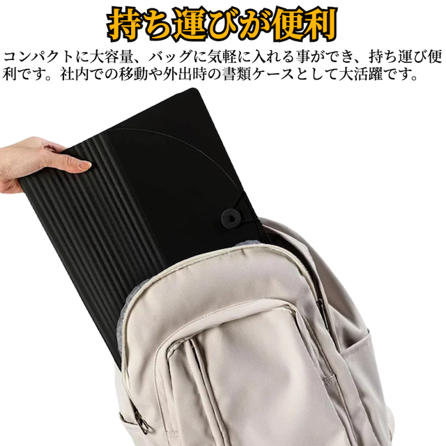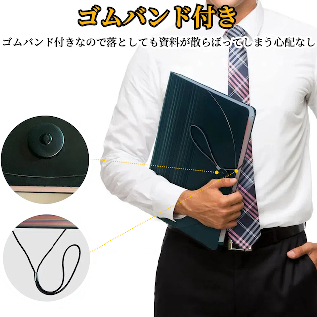 アコーディオン式の資料ファイルは開口部が大きく開けるので、資料検索や資料の取り出しが簡単です。蓋はゴムバンドで固定され、開閉も簡単で、持ち運びの際に資料が落ちる心配がありません。資料の紛失を防ぐ事ができます。