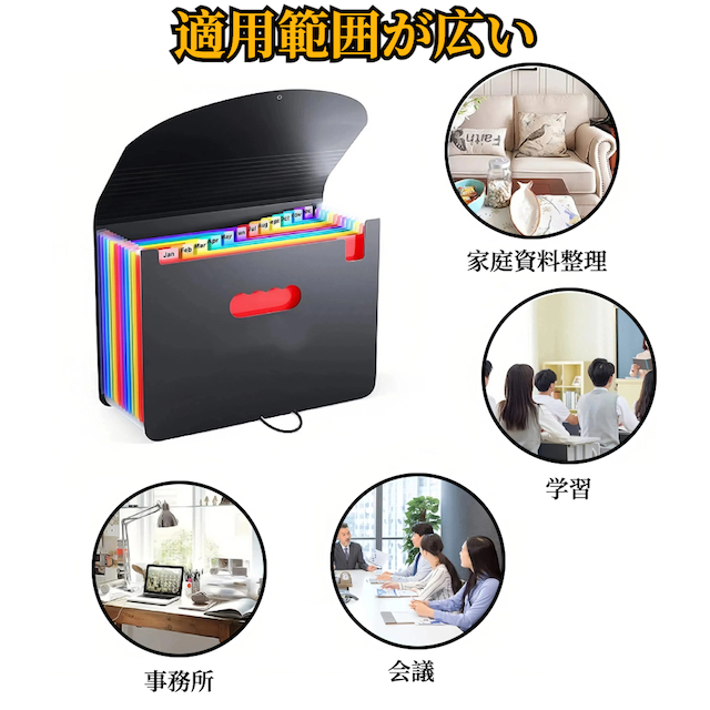 会社だけではなく、スクールや自宅でもご利用いただけます。書類、メモ、ダイレクトメールの分類保管。納品書や請求書などの伝票整理、取り扱い説明書や領収書の保管、子供の作文や自由研究の整理、試験勉強用資料や会議用書類などの整理保管、年賀状やポストカードの分類保管など様々なシーンで活躍します。| 商品詳細 | |