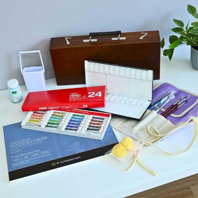 収納ケースから絵具、筆、メディウム、水彩用スケッチブックまで全てが揃ったセットです。