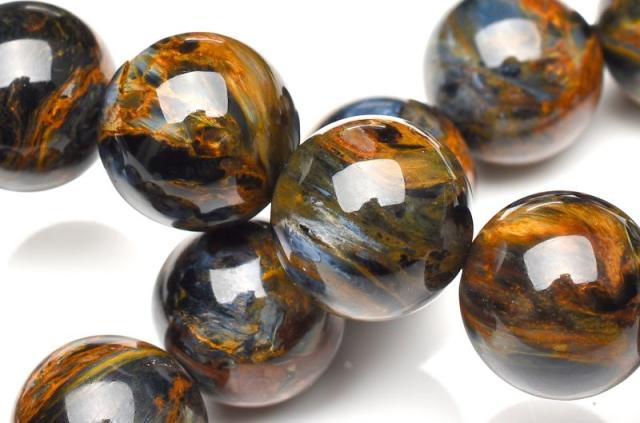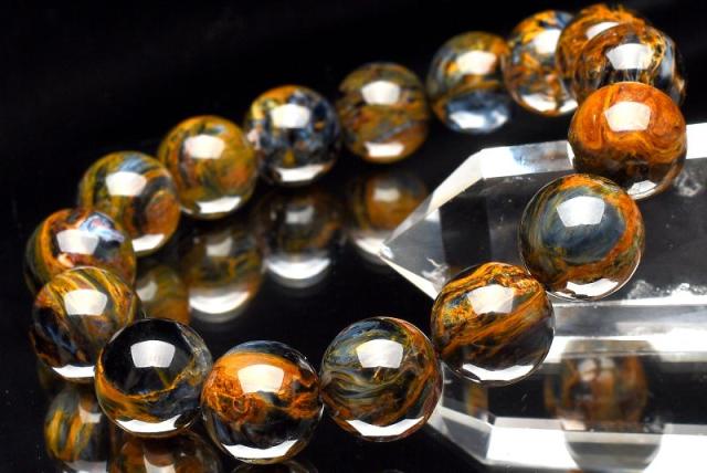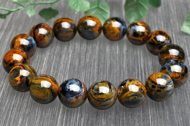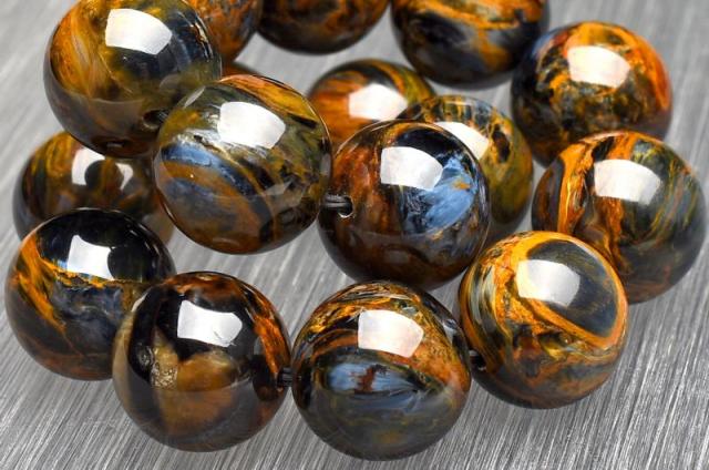 | 特徴・意味 | 幻想的なシャトヤンシーがとても美しいです。 1粒1粒異なったマーブル模様がなんとも美しく上質です。 タイガーアイとはまた違うベルベットな雰囲気を彷彿させる上品さがあり、見る人を惹き付けます。 1962年、南アフリカのナミビアで、シッド・ピータースによって発見された新しい石。 タイガーアイやブルータイガーアイが地殻変動で崩れた後、再度石英で固まったものです。 一般的にはタイガーアイ系の茶褐色が多いですが、ブルータイガーの青系もあり、茶と青の混じったものもあります。 独特の粉々になった模様が嵐のようだというので、テンペストストーン(嵐の石)とも呼ばれます。 タイガーアイは、石英(せきえい)の中に、青い石綿が入ったもので、めのうの仲間です。 これが地熱で温まり、黄色になったのが、タイガーアイです。 ブルータイガーアイの一筋の光が、一度崩れたことによって、あちこちを向いて輝いていて、神秘的な感じになっています。 渋くて不思議なものが好きな方には、たまらないかも。 どこかのブランド物の織物のようです。 地殻や自然の激しい動きにさらされた石は、困難を切り抜ける知恵を持っています。 ピーターサイトは、めちゃくちゃになった物事を、再度作り上げ、昇華していこうとする人に、援助を惜しまない石です。 ブルータイガーアイよりも、さらに強いエネルギーを求めたい人におすすめ。 |