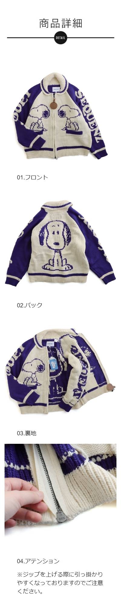 ・フロントジップのレザー引手には、スヌーピーエンボス加工。取り外せるので、他の洋服の引手にするのも◎