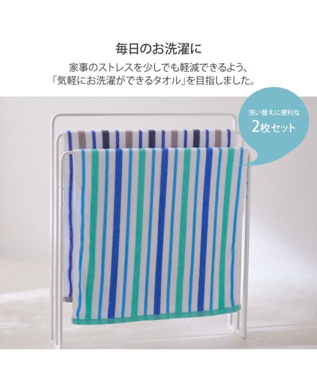 さわやかなストライプ柄でバスルームを彩る、ふんわり柔らかなバスタオル2枚セット。 綿100%の優れた吸水性で、お風呂上がりの肌を優しく包み込みます。 毎日使うものだからこそ、肌触りと使い心地にこだわりました。 清潔感あふれるデザインは、どんなインテリアにも馴染み、空間を明るく演出します。 ご自宅用はもちろん、新生活のお祝いやちょっとしたプレゼントにも最適です。 心地よい肌触りと、使い勝手の良さをぜひお試しください。
