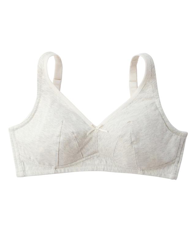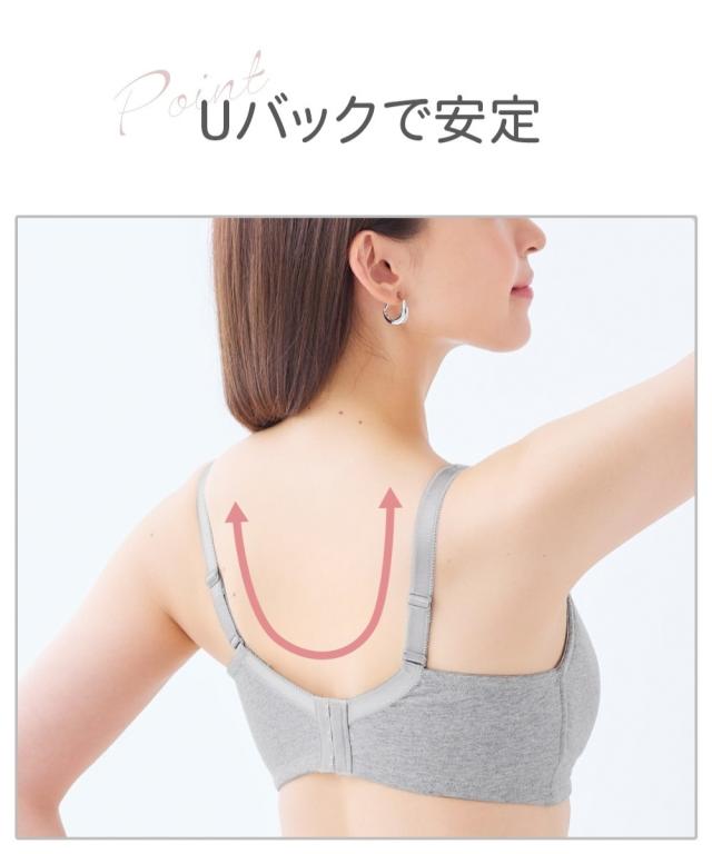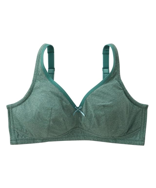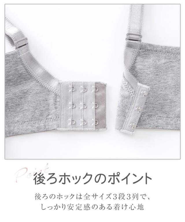 素肌にやさしい綿混フルカップノンワイヤーブラジャー こだわりポイント ・すっぽり包み込むフルカップ ・優しい共布の幅広ストラップ ・汗ばむ素肌にうれしい綿混素材で快適 ・カップ素材は不織布の4枚接ぎで丸い自然なバストシルエット ・カップ肌側の綿混素材パネルでバストの脇流れをソフトにサポート ・ボーンがないので脇高設計でも肌へのくいこみなくハミ肉を防止 ・バック部分は綿混素材2重でしっかりサポート ・生地はよく伸びるストレッチ素材で身体にフィット ・ストラップは幅広共生地で肩が楽、ストラップ調節もできるのでしっかり持ち上げる ・バックホックは3段3列でしっかり安定