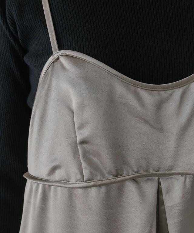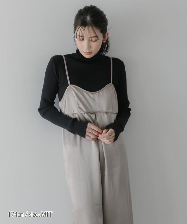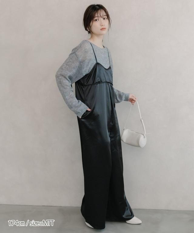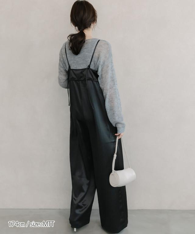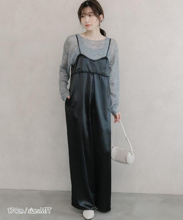 【高身長な方向け】着るだけで華やぐリッチな光沢サテンと美シルエットで魅せるキャミオールインワン ■デザイン 上品な光沢を放つサテン素材を贅沢に使用したキャミソール型のオールインワン。胸元は、立体的な切り替えを施し、まるでビスチェを重ねたようなデザインに仕上げました。ドレッシーになりすぎないよう、身体のラインを拾いにくいワイドシルエットを採用しています。ハイウエストの切り替えと落ち感のある素材が、脚長効果とすっきりとした印象を両立しています。肩紐部分はお好みの位置で結んで調節が可能です。 ■素材 やや厚手の上品なツヤ感あるサテン素材を使用。 ■おすすめのスタイリング インナー次第でシーズンレスに楽しめるアイテム。アクセサリーや小物次第で、普段使いから結婚式の二次会などのオケージョンシーンまで幅広く活躍します。