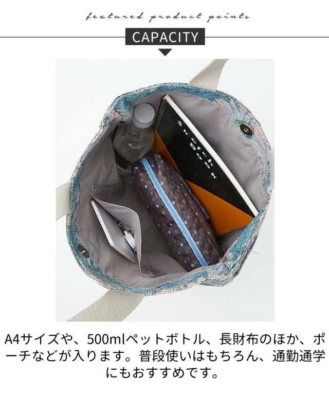 材質=ポリエステル・綿・レーヨン サイズ=たて約37×よこ(上部)約37(底部)約32×まち幅約6cm 開閉=マグネット ポケット=中:1個(オープン1)外:2個(オープン2) 持ち手(あがり)=約31cm 重量=約290g A4ファイル対応 原産国:中国製