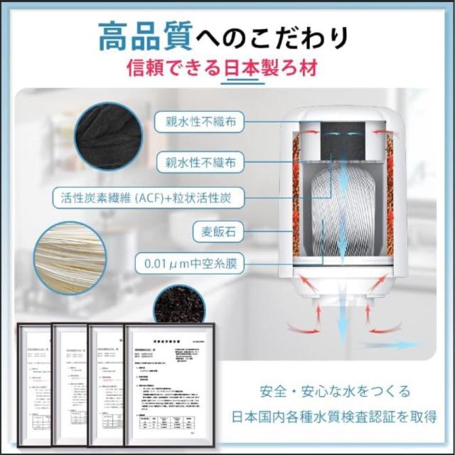 フィルター製品は、材質の面で全面的にグレードアップし、より先進的な高密度活性炭を採用し、厳選国産濾材,フィルターによる六層ろ過システムで水道水の不純物の80%以上を除去できます純正品と同等の使用期間を実現しながら、より微細な不純物と汚染物質を効果的に遮断しました。新材質は耐腐食性・耐圧性に優れ、高温多湿などの過酷環境下でも性能を安定維持しています。流体の通過時の抵抗を低減し流通効率を向上させることで、高効率フィルタリングと省エネ性を両立させます。