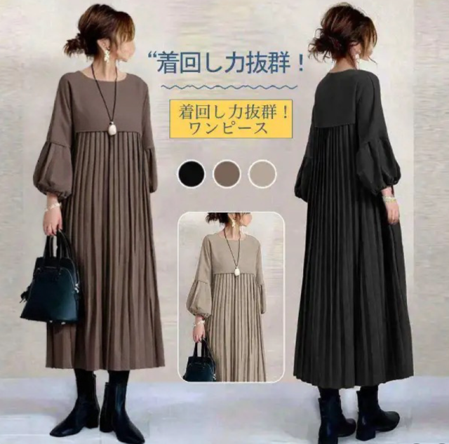 プリーツワンピース 長袖 レディース 秋冬 パフスリーブ ロングワンピース お呼ばれワンピース 大人きれいめ 着回し40代