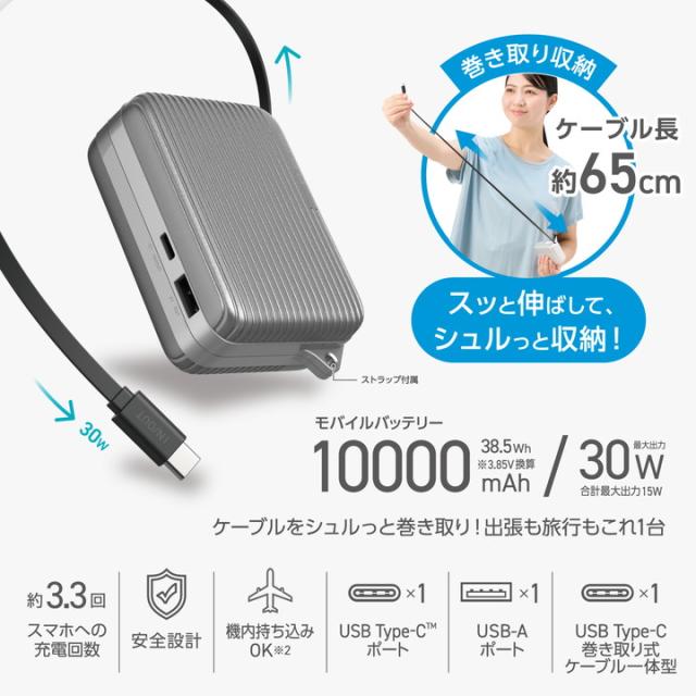 エレコム モバイルバッテリー 巻き取り式 ケーブル一体型 モバイルバッテリー 10000mAh 30W リチウムイオン電池 Type-C ケーブル USB-A シルバー ┃DE-C79-10000SV