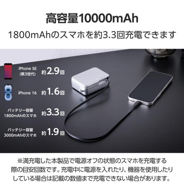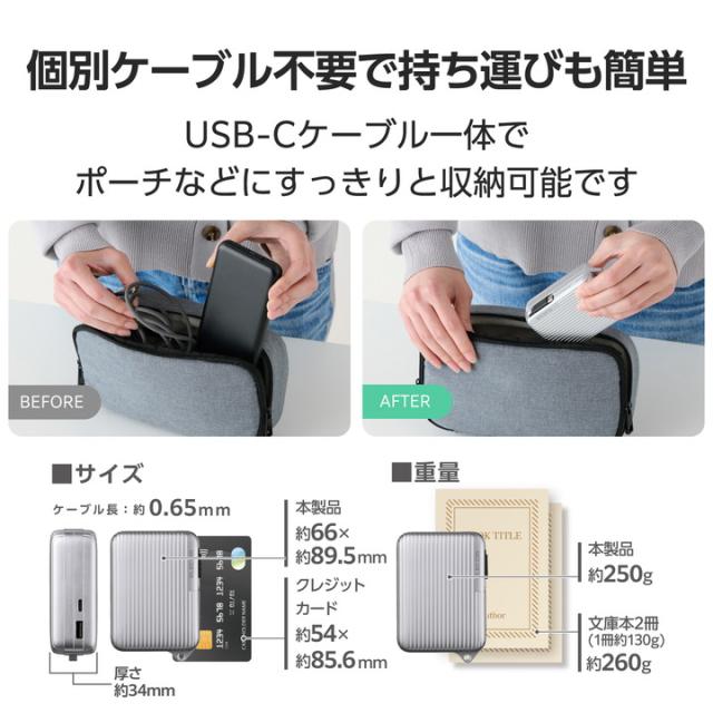 スッと伸ばして、くるっと収納!本体一体型の巻き取り式USB Type-C(TM)ケーブルを備えた、キャリーケースデザインのモバイルバッテリーです。最大出力30Wなので、スマートフォンやタブレットはもちろん、ノートパソコンの充電も可能です。容量10000mAhで外出先でも安心して充電できます。ケーブルを持ち忘れる心配がなく、必要な長さに調節して使用できます。![]() ■旅行や出張にぴったりのキャリーケース風デザインが映える、容量10000mAhのモバイルバッテリーです。本体一体型の巻き取り式USB Type-C(TM)ケーブルを備えています。 ■本体一体型ケーブルは巻き取り式のため、使用後はケーブルを巻き取って、すっきりと収納可能。ケーブルの長さは約65cmあり、必要な分だけ引き出して充電しながらスマートフォンを使用できます。 ■一体型のUSB Type-Cケーブルに加え、USB Type-Cポート×1とUSB-Aポート×1も搭載しています。 ■※複数の機器を同時に充電する場合は、1ポート/1ケーブルあたりの出力が低下するため、ご使用の機器によっては充電できない場合があります。 ■※同時出力時は、2ポートでも2ポート/1ケーブルでも、合計最大15Wを分配して充電を行います。 ■最大30Wの高出力でスマートフォンやタブレットを充電できるのはもちろん、MacBook Airなどのノートパソコンにも対応しているため、外出先で急にバッテリーが切れても安心です。 ■※一体型のUSB Type-Cケーブル、またはUSB Type-Cポートの単独出力時に限ります。 ■※30W以下のUSB Type-C入力に対応したパソコンに限ります。 ■USB-Aポートの単独使用時は最大22.5Wの出力が可能です。 ■モバイルバッテリーはUSB Type-C充電式です。AC充電器に接続して充電してください。 ■※AC充電器は同梱しておりません。別途ご購入またはご用意ください。 ■※AC充電器は30W以上を推奨します。30W未満のAC充電器で充電した場合や、USB Type-C - USB-Aケーブルで充電した場合、パッケージやHPに記載の時間では満充電にならない場合があります。 ■本体充電用ケーブルを接続したままで、モバイルバッテリーとスマートフォンをまとめて充電できる”まとめて充電”に対応しています。 ■※本製品はパススルー充電に対応しており、バッテリーを介さずに充電器から接続機器へ直接充電するため、電池の劣化を抑えられます。 ■低電流モードによりBluetooth(R)ヘッドセット・イヤホンなどの小型電子機器を最適な電流で充電できます。 ■※USB-Aポートのみ対応します。 ■接続機器を見分けて最適な充電を行う”おまかせ充電”に対応しています。 ■※USB-Aポートのみ対応します。 ■USB Power Delivery(PD)規格およびPPS規格に対応。接続機器に応じて電圧や電流を自動調整するため、iPhoneなどのスマートフォンやタブレット等を効率的に充電できます。 ■※USB Power Deliveryとは、アダプターと接続機器間で情報をやり取りすることで、その機器間における最適な電力を選択し、高速充電を実現するUSB規格です。PPS(Programmable Power Supply)とは、0.02V単位で電圧を調整し、最適な電力で効率的に供給することができるUSB Power Deliveryのオプション規格です。 ■本製品(バッテリー容量10000mAh)で、1800mAhのスマートフォンを約3.3回、3000mAhのスマートフォンを約1.9回充電可能です。 ■※満充電した本製品で電源オフの状態のスマートフォンを充電する際の目安回数です。充電中に電源を入れたり、機器を使用したりしている場合は記載の数値まで充電できない場合があります。 ■NINTENDO SWITCH(TM) 2/NINTENDO SWITCH(TM)/NINTENDO SWITCH Lite(TM)対応です。 ■※ドックでの使用に対応していません。 ■CCC(中国強制製品)認証品なので、中国国内線への機内持ち込みが可能です。 ■約500回繰り返し使用可能な充電式リチウムイオン電池を搭載しています。 ■Thermal Protectionを搭載し、製品温度の上昇を監視・制御。自動で出力をコントロールし、お使いの機器を守ります。 ■過充電・過放電・過電流防止機能および短絡保護機能と温度検知機能の5つの保護機能を備えた安心の回路設計です。 ■電池容量が160Wh(43,243mAh)以下であるため、機内持ち込みも可能です。 ■※航空会社の規定によって例外がある場合があります。 ■日本の電気用品安全法(PSE)の技術基準に適合した安全性の高い商品です。 ■内蔵の充電式リチウムイオン電池は、JIS C 62133-2:2020およびJIS C 8715-2:2024に準拠した安全設計です。 ■手持ちの際に便利な、丸紐タイプのストラップが付属しています。 ■※工場出荷時に70%程度充電されています。充電式リチウムイオン電池は時間とともに放電するので、ご使用になる前に充電することを推奨します。 ■※ケーブルを挿したままにしておくとバッテリーの残量が減ってしまいます。使用しないときは、必ずケーブルを外してください。 ■※一体型USB Type-CケーブルおよびUSB Type-Cポートのいずれからも本製品を充電できますが、同時に入力することはできません。 ■※USB Type-C and USB-C are trademarks of USB Implementers Forum. ■本製品は、一般社団