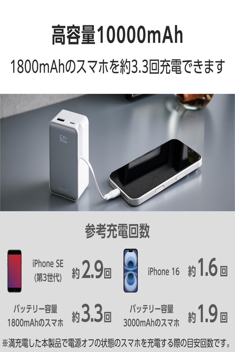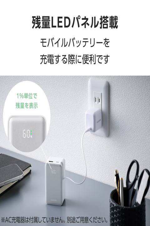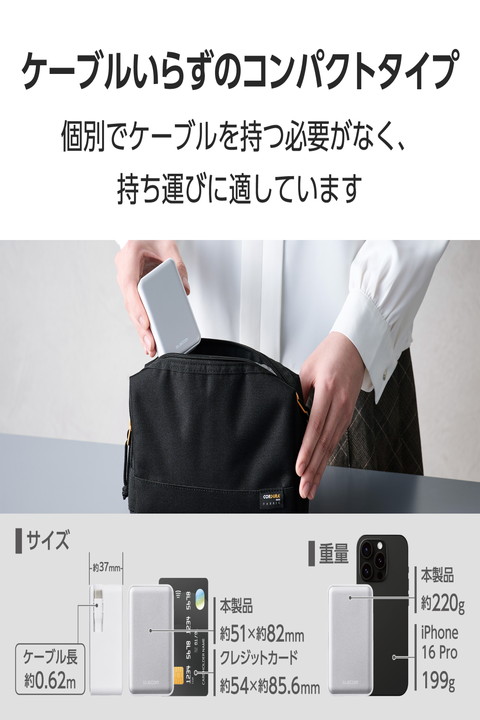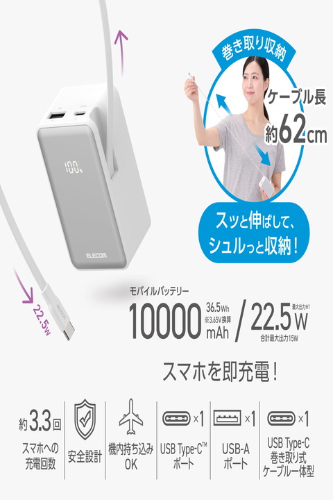 スッと伸ばして、くるっと収納!持ち運びに便利な本体一体型の巻き取り式USB Type-C(TM)ケーブルを備えたモバイルバッテリーです。容量10000mAhで外出先でも安心して充電できます。ケーブルを持ち忘れる心配がなく、必要な長さに調節して使用できます。![]() ■本体一体型の巻き取り式USB Type-C(TM)ケーブルを備えた、容量10000mAhのモバイルバッテリーです。 ■本体一体型ケーブルは巻き取り式のため、使用後はケーブルを巻き取って、すっきりと収納可能。ケーブルの長さは約62cmあり、必要な分だけ引き出して充電しながらスマートフォンを使用できます。 ■一体型のUSB Type-Cケーブルに加え、USB Type-Cポート×1とUSB-Aポート×1も搭載しています。 ■※複数の機器を同時に充電する場合は、1ポート/1ケーブルあたりの出力が低下するため、ご使用の機器によっては充電できない場合があります。 ■※同時出力時は、2ポートでも2ポート/1ケーブルでも、合計最大15Wを分配して充電を行います。 ■最大出力は22.5Wなので、スマートフォンを充電できます。外出先での急なバッテリー切れでも安心です。 ■※USB-Aポートの単独出力時に限ります。 ■※USB-Aポートの出力22.5Wは、HUAWEI機器のみに対応しています。 ■一体型ケーブルもしくはUSB Type-Cポートから、USB Power Delivery 最大20Wの出力が可能です。スマートフォンやタブレットを充電できます。 ■※PPS適用時は最大22Wの出力が可能です。 ■モバイルバッテリーはUSB Type-C充電式です。AC充電器に接続して充電してください。 ■※AC充電器は同梱しておりません。別途ご購入またはご用意ください。 ■※AC充電器は20W以上を推奨します。20W未満のAC充電器で充電した場合や、USB Type-C - USB-Aケーブルで充電した場合、パッケージやHPに記載の時間では満充電にならない場合があります。 ■本体充電用ケーブルを接続したままで、モバイルバッテリーとスマートフォンをまとめて充電できる”まとめて充電”に対応しています。 ■※本製品はパススルー充電に対応しており、バッテリーを介さずに充電器から接続機器へ直接充電するため、電池の劣化を抑えられます。 ■低電流モードによりBluetooth(R)ヘッドセット・イヤホンなどの小型電子機器を最適な電流で充電できます。 ■※USB-Aポートのみ対応します。 ■接続機器を見分けて最適な充電を行う”おまかせ充電”に対応しています。 ■※USB-Aポートのみ対応します。 ■USB Power Delivery(PD)規格およびPPS規格に対応。接続機器に応じて電圧や電流を自動調整するため、iPhoneなどのスマートフォンやタブレット等を効率的に充電できます。 ■※USB Power Deliveryとは、アダプターと接続機器間で情報をやり取りすることで、その機器間における最適な電力を選択し、高速充電を実現するUSB規格です。PPS(Programmable Power Supply)とは、0.02V単位で電圧を調整し、最適な電力で効率的に供給することができるUSB Power Deliveryのオプション規格です。 ■本製品(バッテリー容量10000mAh)で、1800mAhのスマートフォンを約3.3回、3000mAhのスマートフォンを約1.9回充電可能です。 ■※満充電した本製品で電源オフの状態のスマートフォンを充電する際の目安回数です。充電中に電源を入れたり、機器を使用したりしている場合は記載の数値まで充電できない場合があります。 ■LEDパネルでバッテリー残量を1%単位で確認しながら使えます。事前にモバイルバッテリーを充電する際などに便利です。 ■NINTENDO SWITCH(TM) 2/NINTENDO SWITCH(TM)/NINTENDO SWITCH Lite(TM)対応です。 ■※ドックでの使用に対応していません。 ■約1000回繰り返し使用可能な充電式リチウムイオン電池を搭載しています。 ■Thermal Protectionを搭載し、製品温度の上昇を監視・制御。自動で出力をコントロールし、お使いの機器を守ります。 ■過充電・過放電・過電流防止機能および短絡保護機能と温度検知機能の5つの保護機能を備えた安心の回路設計です。 ■電池容量が160Wh(43,243mAh)以下であるため、機内持ち込みも可能です。 ■※航空会社の規定によって例外がある場合があります。 ■日本の電気用品安全法(PSE)の技術基準に適合した安全性の高い商品です。 ■内蔵の充電式リチウムイオン電池は、JIS C 62133-2:2020およびJIS C 8715-2:2024に準拠した安全設計です。 ■※工場出荷時に70%程度充電されています。充電式リチウムイオン電池は時間とともに放電するので、ご使用になる前に充電することを推奨します。 ■※ケーブルを挿したままにしておくとバッテリーの残量が減ってしまいます。使用しないときは、必ずケーブルを外してください。 ■※一体型USB Type-CケーブルおよびUSB Type-Cポートのいずれからも本製品を充電できますが、同時に入力することはできません。 ■※USB Type-C and USB-C are trademarks of USB Implementers Forum. ■本製品は、一般社団法人JBRCの回収対象製品であり、回収協力自治体や協力店(家電量販店・ホームセンターなど)で回収が可能です。 ■※JBRCのホームページでお住まいの地域の回収協力自治体・協力店をご確認