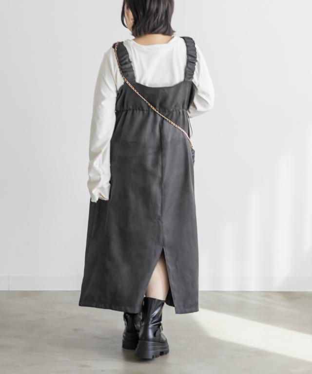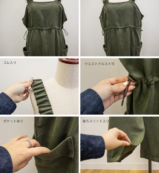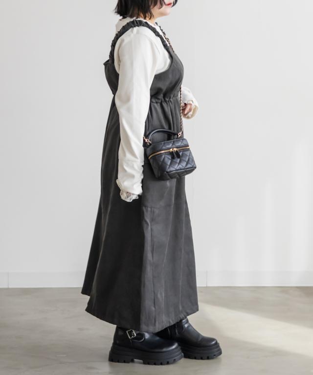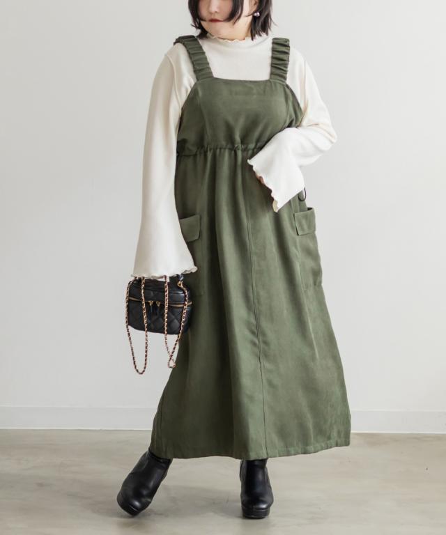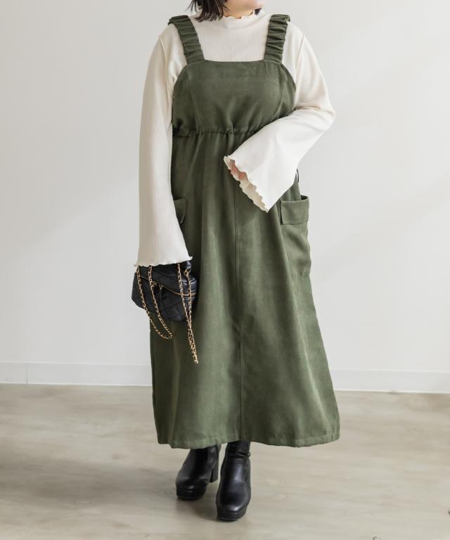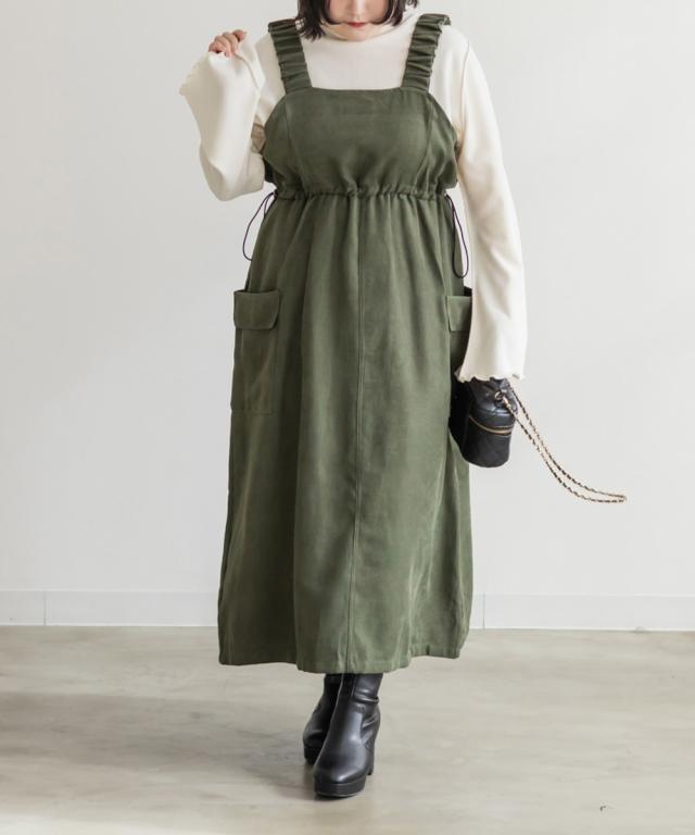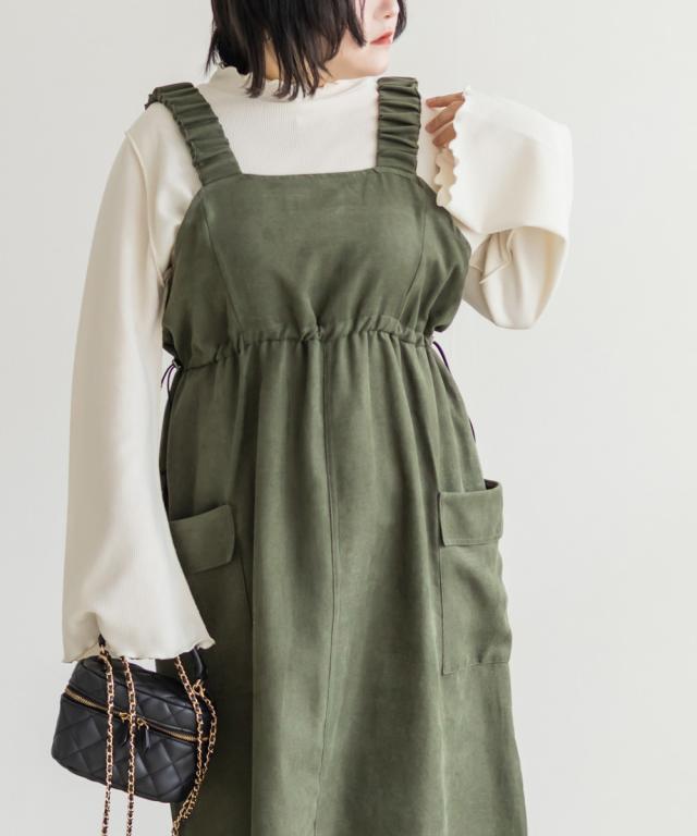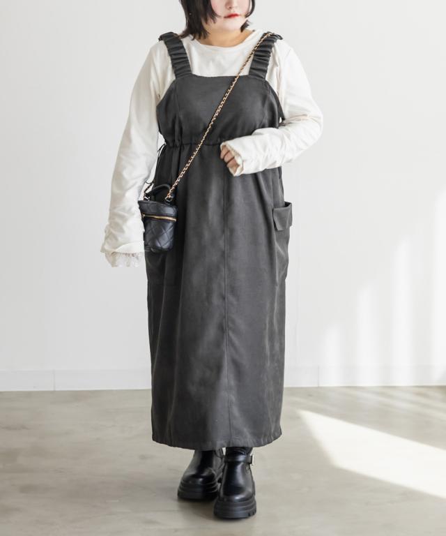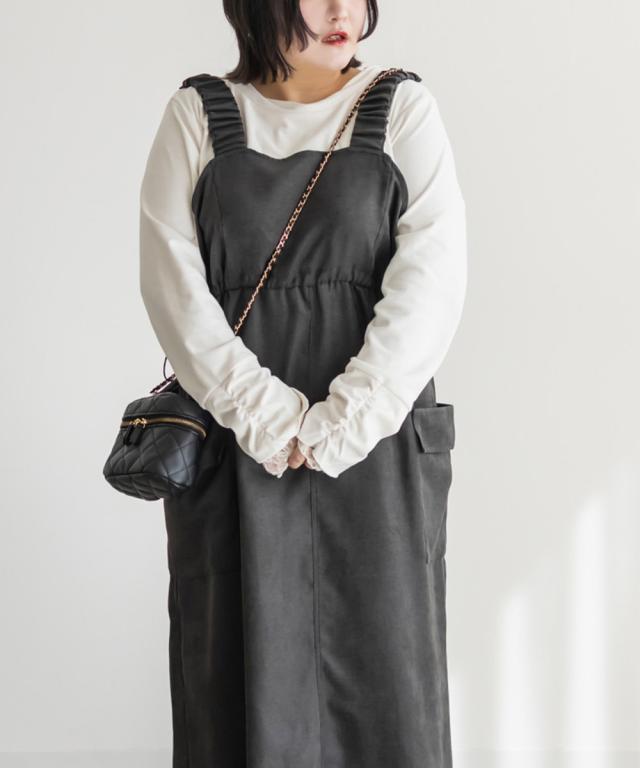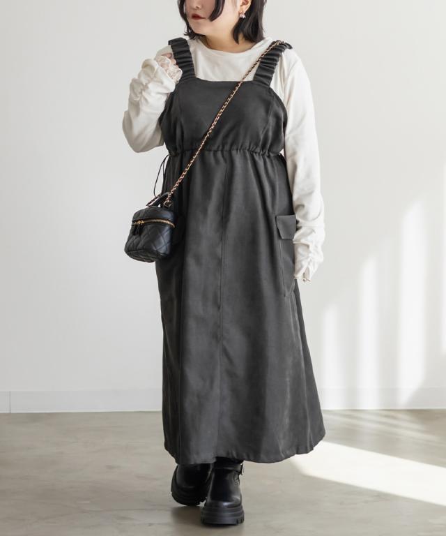 | 3Lサイズを着用して、程よくゆとりのあるサイズ感でした♪ ゆったりとしたシルエットですが、ストンと落ちるデザインなのでスッキリ見えます◎ 太めのストラップはゴム入りで肩にしっかりフィットしてくれるので安定感があり、楽な着心地でした! サイドにはポケット付きで機能性も抜群♪ レーストップスと合わせてフェミニンにしたり、Tシャツやニットを合わせてカジュアルに着こなすのもおすすめです! スニーカーやブーツなど、足元のアレンジで印象を変えられる万能ジャンスカワンピです♪ |