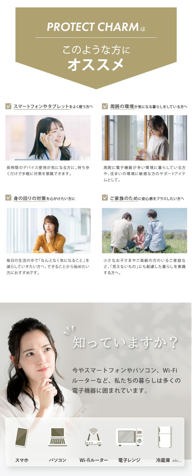 | 商品特性 | 従来の“遮断・カット”とは異なる発想から開発された独自の仕組みを採用。周囲の電波や電磁波などの環境を活かしながら、リラックスライフをサポートします。 ※5G環境下でもご利用いただけます。 |