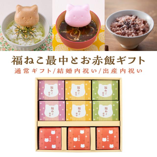 赤飯3つと選べる猫最中のセット。最中は、みそ汁最中(赤みそ・白みそ)、お吸物最中、お茶漬け最中