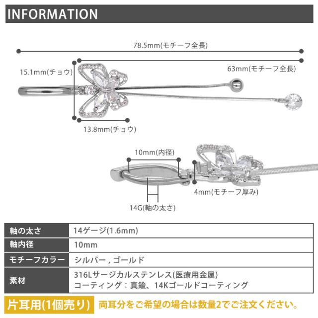 蝶が飛んでいるようなデザインの華やかなフープピアス。 透かしデザインのバタフライが美しい高見えリングピアスです。 ヒンジで開け閉めできるキャッチ一体型のワンタッチ構造なので簡単で快適な使い心地です。 キャッチをなくす心配もない、不器用さんも安心のクリップリングです。 肌に直接触れるフープ部分はアレルギーが起きにくい医療用のサージカルステンレス素材なので安心です。
