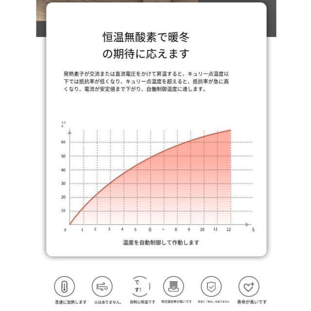 高速暖房で室温を長時間維持。発熱部分は安定性高いPTC発熱エレメントを採用しています。