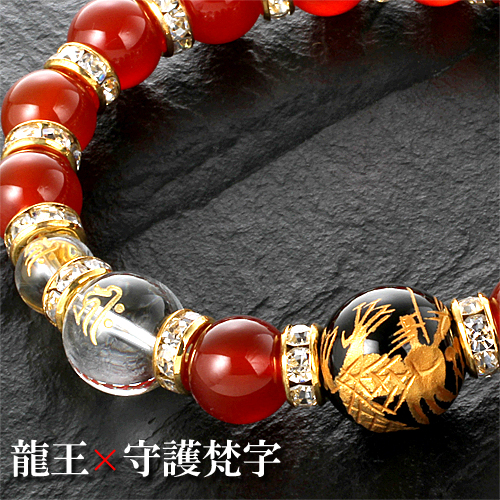 白水晶2個(12mm珠 梵字刻印)、2個(8mm珠 梵字刻印)、赤メノウ11個(10mm珠)、オニキス1個(14mm珠 龍刻印)、ロンデル16個(8×4mm 真鍮/ラインストーン)