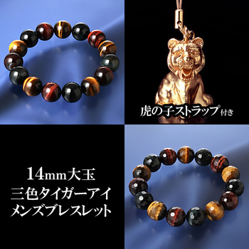 大粒三色タイガーアイ メンズブレス 虎の子ストラップ付き