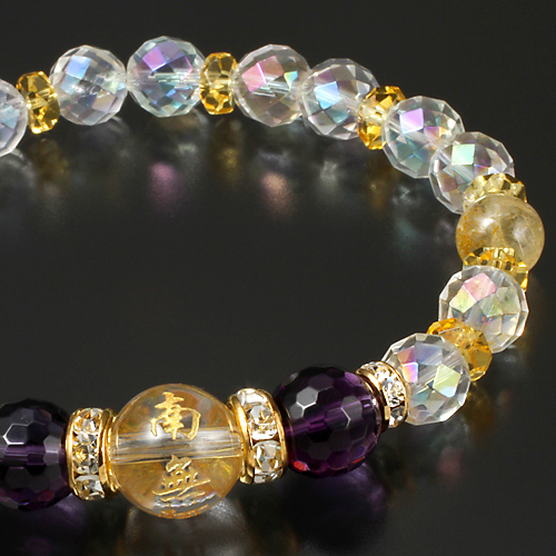 白水晶1個(12mm珠 南無阿弥陀佛刻印)、14個(8mm珠/64面カット オーロラメッキ)、黄水晶10個(6×3mm/カット)、アメジスト2個(10mm珠/128面カット)、金針水晶2個(8mm珠)、ロンデル2個(8×4mm 真鍮/ラインストーン)、2個(6×3mm 真鍮/ラインストーン)[サイズ]約18cm(内径)[重量]約19g[中糸]ポリウレタンゴム[付属品]専用巾着袋[個装サイズ]縦15.8×横10.0×高さ2.0(cm)/29.0(g)