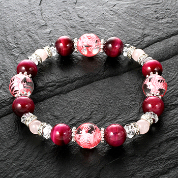 白水晶4個(12mm珠 龍刻印)、8個(6×3mm/カット)、ピンクタイガーアイ8個(10mm珠)、ローズクォーツ4個(6mm珠)、ロンデル8個(6×3mm 真鍮/ラインストーン)、ビーズパーツ 8個(7mm 真鍮)