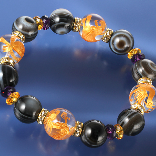 白水晶4個(16mm珠 四神獣刻印)、黄水晶4個(8×4mm/カット)、アメジスト4個(8×4mm/カット)、天眼石8個(14mm珠)、ロンデル8個(8×4mm 真鍮/ラインストーン)