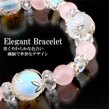 ルナフラッシュ20個(6mm珠/スターカット)、白水晶1個(12mm珠 桜刻印)、2個(8mm珠/64面カット オーロラ加工)、14個(6mm珠)、24個(6×3mm/カット)、アメジスト3個(6mm珠/128面カット)、2個(6×3mm/カット)、ローズクォーツ2個(6mm珠)、翡翠2個(6mm珠)、インカローズ1個(6mm珠)、ロンデル2個(6×3mm 真鍮/ラインストーン)
