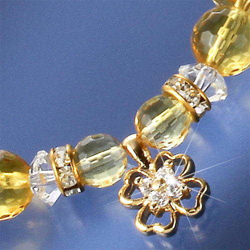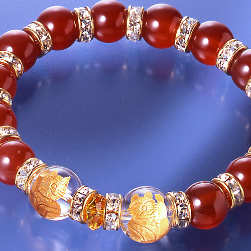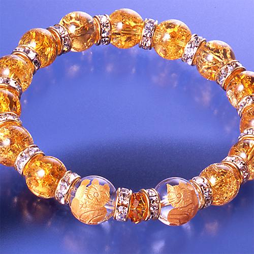 白水晶2個(12mm珠 招猫刻印)、黄水晶1個(8×4mm/カット)、赤メノウ13個(10mm珠)、ロンデル16個(8×4mm 真鍮/ラインストーン)