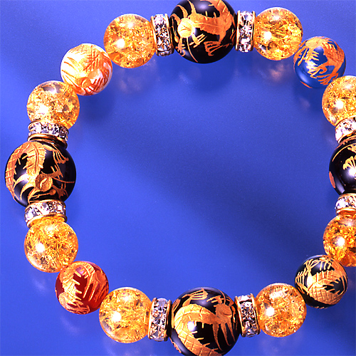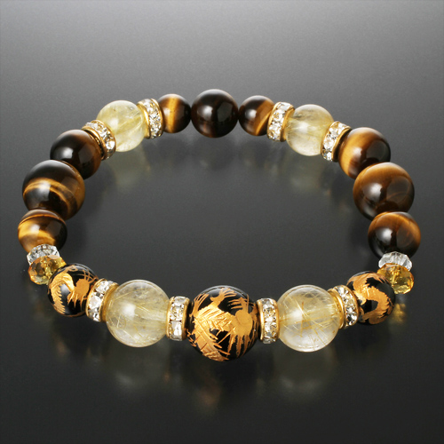白水晶2個(6×3mm/カット)、黄水晶2個(8×4mm/カット)、金針水晶2個(12mm珠)、2個(10mm珠)、虎目石2個(12mm珠)5個(10mm珠)、2個(8mm珠)、オニキス1個(14mm珠 龍刻印)、2個(10mm珠 龍刻印)、ロンデル8個(8×4mm 真鍮/ラインストーン)