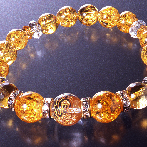 白水晶1個(12mm珠 薬師如来刻印)、4個(8×4mm/カット)、黄水晶2個(10mm珠/128面カット)、4個(6×3mm/カット)、爆裂黄水晶2個(12mm珠)、2個(10mm珠)、9個(8mm珠)、ロンデル4個(8×4mm 真鍮/ラインストーン)