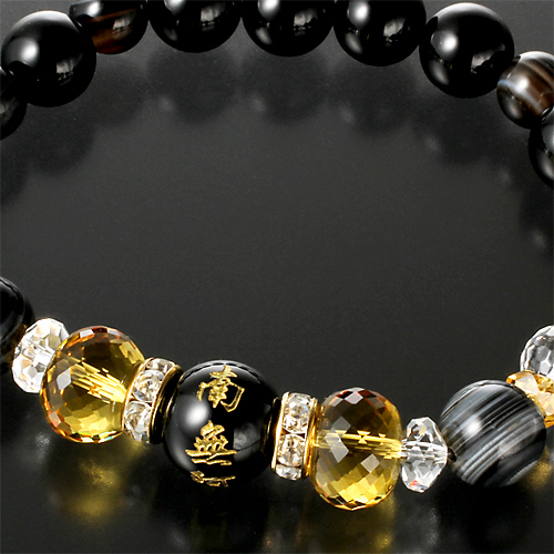 白水晶2個(8mm珠/128面カット)、2個(8×4mm/カット)、黄水晶2個(12×8mm/カット)、2個(6×3mm/カット)、天眼石2個(10mm珠)、4個(8mm珠)、オニキス1個(12mm珠 南無阿弥陀佛刻印)、ロンデル2個(8×4mm 真鍮/ラインストーン)、ビーズパーツ2個(4mm珠 真鍮)